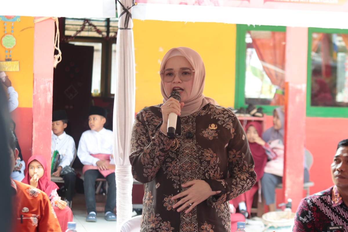 Banyuasin, Kirkanews - Bupati Banyuasin, Netta Indian, SP didampingi oleh Kepala Dinas Pendidikan dan Kebudayaan Banyuasin, Aminudin, S.Pd., S.IP., M.Si memberikan Wakil bantuan buku tulis untuk Sekolah Dasar (SD) dan Sekolah Menengah Pertama (SMP) Se-Kecamatan Rambutan di SD Negeri 5 Rambutan, Kabupaten Banyuasin, Kamis (16/10/2025).