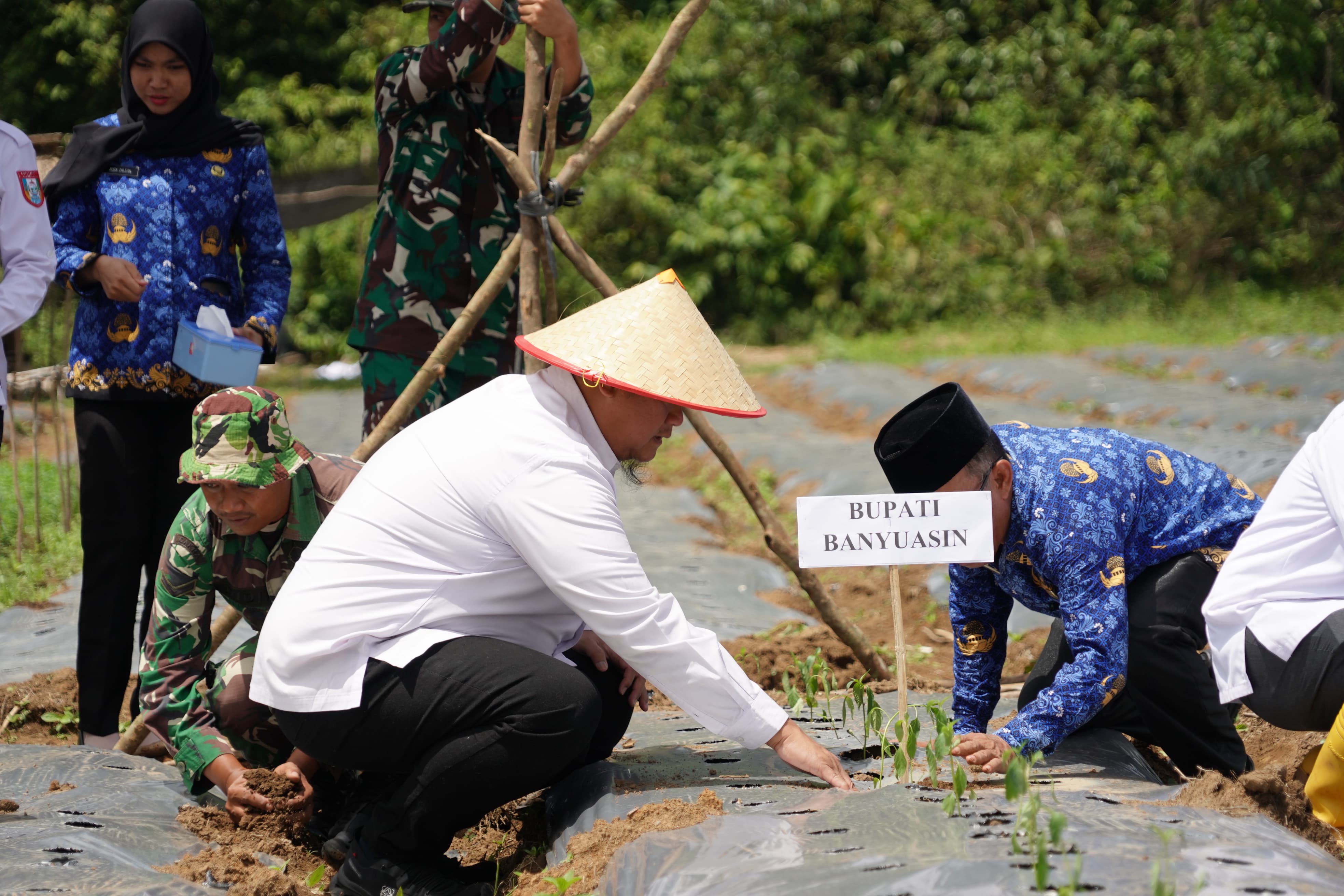 Banyuasin, Kirkanews - Pemerintah Kabupaten Banyuasin melalui Sekretaris Daerah, Ir. Erwin Ibrahim, ST, MM, MBA, IPU., ASEAN Eng., bersama Kodim 0430/Banyuasin melaksanakan kegiatan penanaman perdana bibit cabai sebagai langkah nyata dalam mendukung program ketahanan pangan dan pengendalian inflasi daerah.